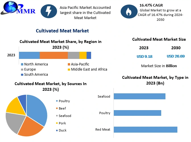 The global Cultivated Meat Market is witnessing a transformative phase, driven by advancements in cellular agriculture and growing concerns over environmental sustainability. Valued at USD 9.18 billion in 2023, the market is projected to grow at a robust CAGR of 16.47% from 2024 to 2030, reaching nearly USD 26.69 billion by the end of the forecast period.