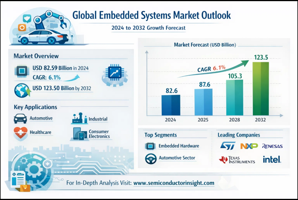 Embedded Systems Market to Reach $123.5B by 2032 Driven by IoT, EVs, AI, and Smart Automation Global Embedded Systems Market, valued at a robust USD 82.59 billion in 2024, is set to experience steady expansion, projected to grow from USD 87.63 billion in 2025 to USD 123.50 billion by 2032. This progression, representing a compound annual growth rate (CAGR) of 6.1%, is detailed in a comprehensive new report published by Semiconductor Insight. The study underscores the indispensable role of these integrated computing systems across nearly every facet of modern technology, from automotive and industrial automation to consumer electronics and healthcare. Get Full Report Here: https://semiconductorinsight.com/report/embedded-systems-market/ 🌐 Website: https://semiconductorinsight.com/ 📞 International: +91 8087 99 2013 🔗 LinkedIn: Follow Us #EmbeddedSystemsMarket #EmbeddedTechnology #IoTtechnology #IndustrialAutomation #AutomotiveElectronics #ElectricVehicles #ADAStechnology #EdgeComputing #ArtificialIntelligence #SmartManufacturing #Microcontrollers #SemiconductorIndustry #DigitalTransformation #Industry40 #TechMarketGrowth #GlobalMarket #SemiconductorInsight