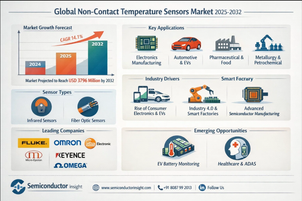 Global Non-Contact Temperature Sensors Market to Reach $3796M by 2032 Amid Electronics Boom Global Non-Contact Temperature Sensors Market was valued at USD 1542 million in 2024. The market is projected to grow from USD 1761 million in 2025 to USD 3796 million by 2032, exhibiting a CAGR of 14.1% during the forecast period. This robust expansion is detailed in a comprehensive new report published by Semiconductor Insight, which underscores the escalating reliance on these critical sensing components across the electronics, manufacturing, and automotive sectors. The study emphasizes how non-contact temperature sensors are fundamental to modern industrial automation, process control, and safety systems, enabling precise thermal monitoring without physical interference, which is paramount in high-speed and delicate manufacturing environments. Read Full Report: https://semiconductorinsight.com/report/non-contact-temperature-sensors-market/ 🌐 Website: https://semiconductorinsight.com/ 📞 International: +91 8087 99 2013 🔗 LinkedIn: Follow Us #NonContactTemperatureSensors #TemperatureSensors #InfraredSensors #FiberOpticSensors #ElectronicsIndustry #SemiconductorIndustry #IndustrialAutomation #SmartManufacturing #Industry40 #EVTechnology #AutomotiveSensors #IoTSensors #MarketGrowth #TechInnovation #ManufacturingTechnology #ProcessControl #PredictiveMaintenance #SensorTechnology #GlobalMarket #SemiconductorInsight