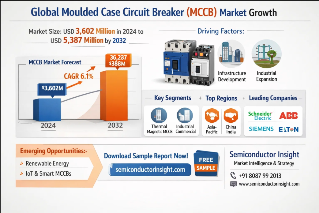 MCCB Market to Reach $5.38B by 2032, Growing at 6.1% CAGR Driven by Infrastructure Demand Global Moulded Case Circuit Breaker (MCCB) Market, which was valued at USD 3,602 million in 2024, is on a steady growth path, projected to reach USD 5,387 million by 2032. This represents a compound annual growth rate (CAGR) of 6.1%, as detailed in a comprehensive new report from Semiconductor Insight. The study underscores the indispensable role these robust electrical protection devices play in safeguarding modern electrical infrastructure across industrial, commercial, and residential applications. Read Full Report: https://semiconductorinsight.com/report/moulded-case-circuit-breaker-mccb-market/ 🌐 Website: https://semiconductorinsight.com/ 📞 International: +91 8087 99 2013 🔗 LinkedIn: Follow Us #MCCBMarket #CircuitBreakerMarket #ElectricalInfrastructure #SmartGridTechnology #PowerDistribution #IndustrialAutomation #EnergyInfrastructure #ElectricalSafety #SemiconductorInsight #MarketResearch #SmartEnergy #IndustrialGrowth #RenewableIntegration #ElectricalEngineering #PowerSystems