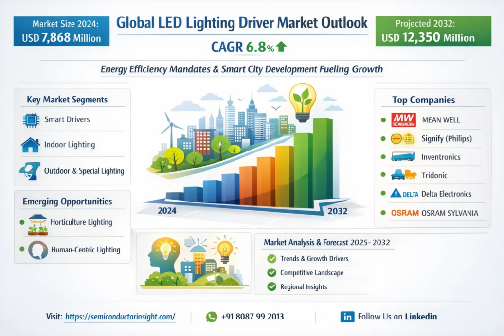 Global LED Lighting Driver Market, valued at USD 7,868 million in 2024, is projected to reach USD 12,350 million by 2032, exhibiting a CAGR of 6.8% during the forecast period. This sustained growth trajectory is detailed in a comprehensive new analysis published by Semiconductor Insight, underscoring the critical function of drivers as the operational heart of modern LED lighting systems across diverse applications.