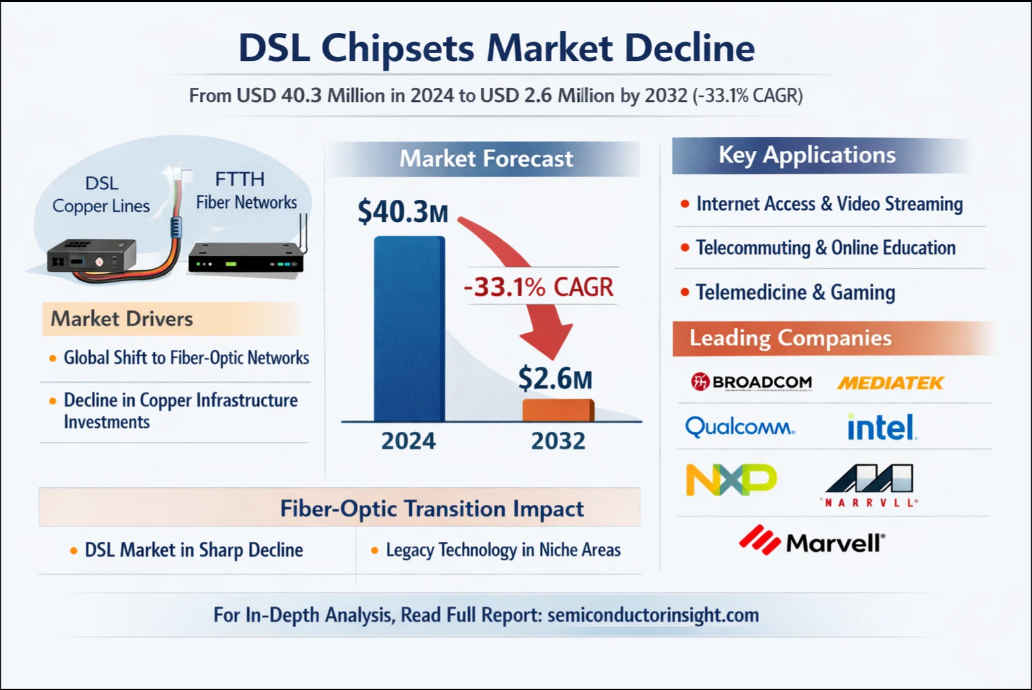 DSL Chipsets Market to Decline Sharply by 2034 Amid Global Shift to Fiber Networks Global DSL Chipsets Market, valued at USD 40.3 million in 2024, is projected to reach USD 2.6 million by 2032, exhibiting a negative compound annual growth rate (CAGR) of -33.1% during the forecast period. This significant market contraction is detailed in a comprehensive new report published by Semiconductor Insight. The study examines the declining role of this legacy connectivity technology in the face of the global transition to fiber-optic networks. Get Full Report Here: https://semiconductorinsight.com/report/dsl-chipsets-market/ 🌐 Website: https://semiconductorinsight.com/ 📞 International: +91 8087 99 2013 🔗 LinkedIn: Follow Us #DSLChipsets #FiberOptics #TelecomIndustry #SemiconductorMarket #Broadband #FTTH #MarketTrends #TechIndustry #DigitalTransformation #NetworkingTechnology #MarketResearch #Gfast #VDSL #FutureOfConnectivity