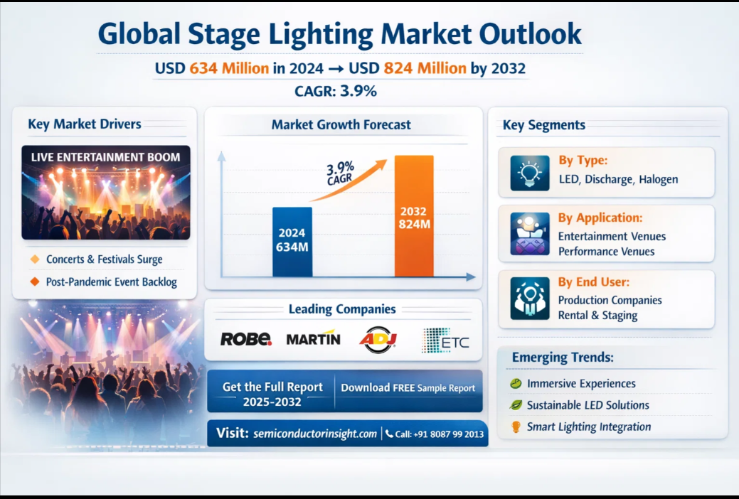 Stage Lighting Market to Hit $824M by 2034 | LED Growth & Live Events Boom Drive Demand Global Stage Lighting Market was valued at a solid USD 634 million in 2024, and is now on a consistent growth path, projected to reach USD 824 million by 2032. This sustained expansion, representing a compound annual growth rate (CAGR) of 3.9%, is detailed in a comprehensive new report published by Semiconductor Insight. The study underscores the essential function of these sophisticated illumination systems in elevating the production value and immersive quality of live events and performances worldwide. Get Full Report Here: https://semiconductorinsight.com/report/stage-lighting-market/ 🌐 Website: https://semiconductorinsight.com/ 📞 International: +91 8087 99 2013 🔗 LinkedIn: Follow Us #StageLighting #LightingMarket #LEDLighting #LiveEvents #EntertainmentIndustry #MarketGrowth #LightingTechnology #EventProduction #SmartLighting #CAGR #MarketTrends #SemiconductorInsight