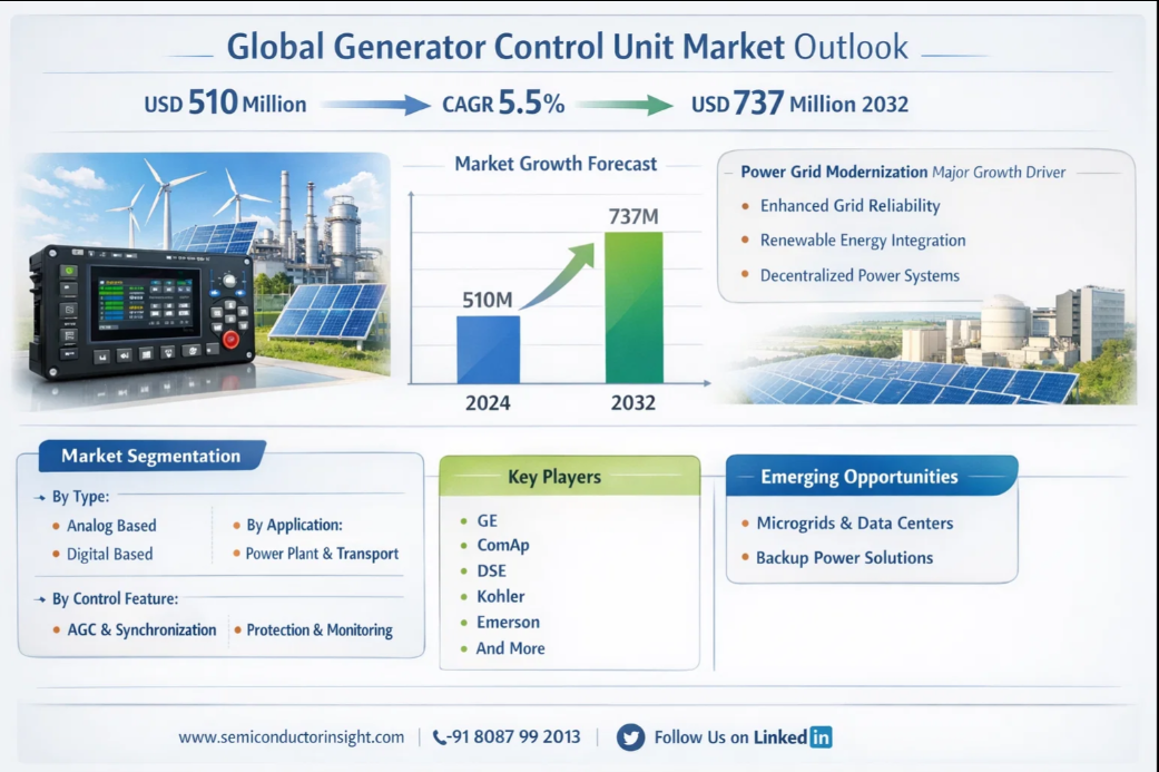 Generator Control Unit Market to Reach $737M by 2034 Driven by Smart Grid Growth Global Generator Control Unit Market, valued at a robust USD 510 million in 2024, is on a trajectory of significant expansion, projected to reach USD 737 million by 2032. This growth, representing a compound annual growth rate (CAGR) of 5.5%, is detailed in a comprehensive new report published by Semiconductor Insight. The study highlights the mission-critical role these sophisticated electronic systems play in maintaining the stability, efficiency, and safety of power generation assets worldwide. Get Full Report Here: https://semiconductorinsight.com/report/generator-control-unit-market/ 🌐 Website: https://semiconductorinsight.com/ 📞 International: +91 8087 99 2013 🔗 LinkedIn: Follow Us #GeneratorControlUnit #PowerGeneration #SmartGrid #EnergyMarket #IndustrialAutomation #Microgrid #DataCenters #RenewableEnergy #MarketGrowth #SemiconductorInsight