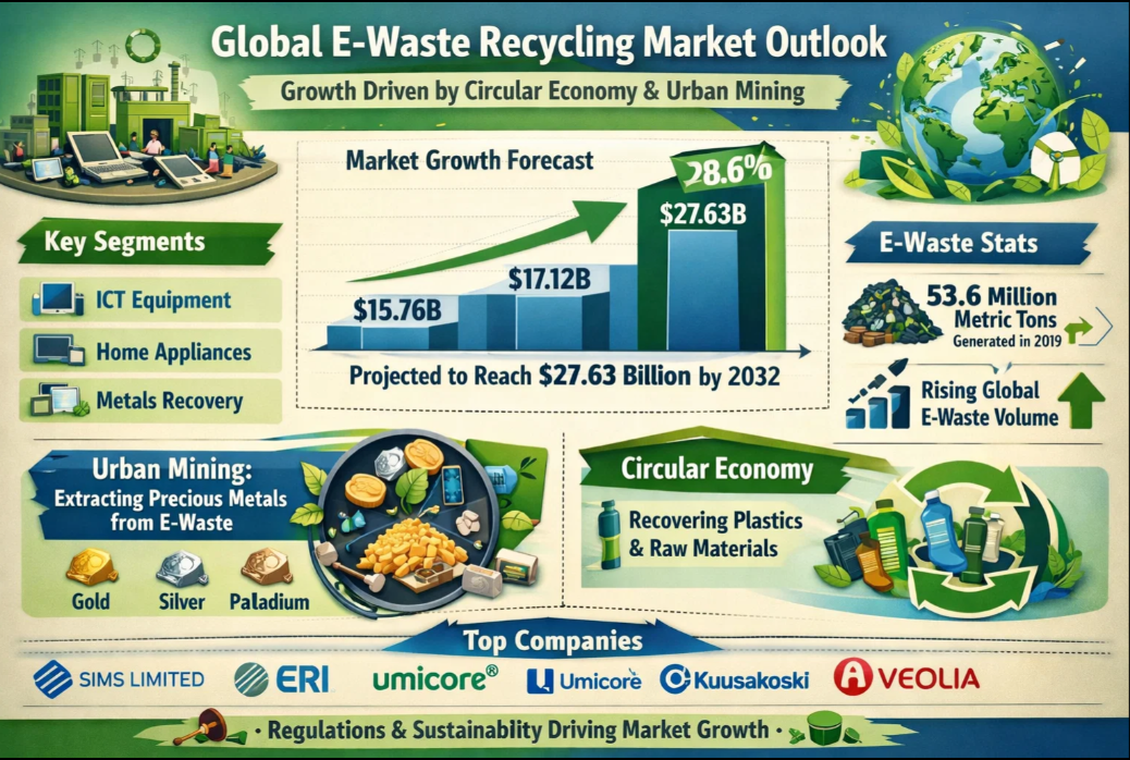 • Global E-Waste Recycling Market to Hit $27.63B by 2032 | Circular Economy & Urban Mining Driving Growth