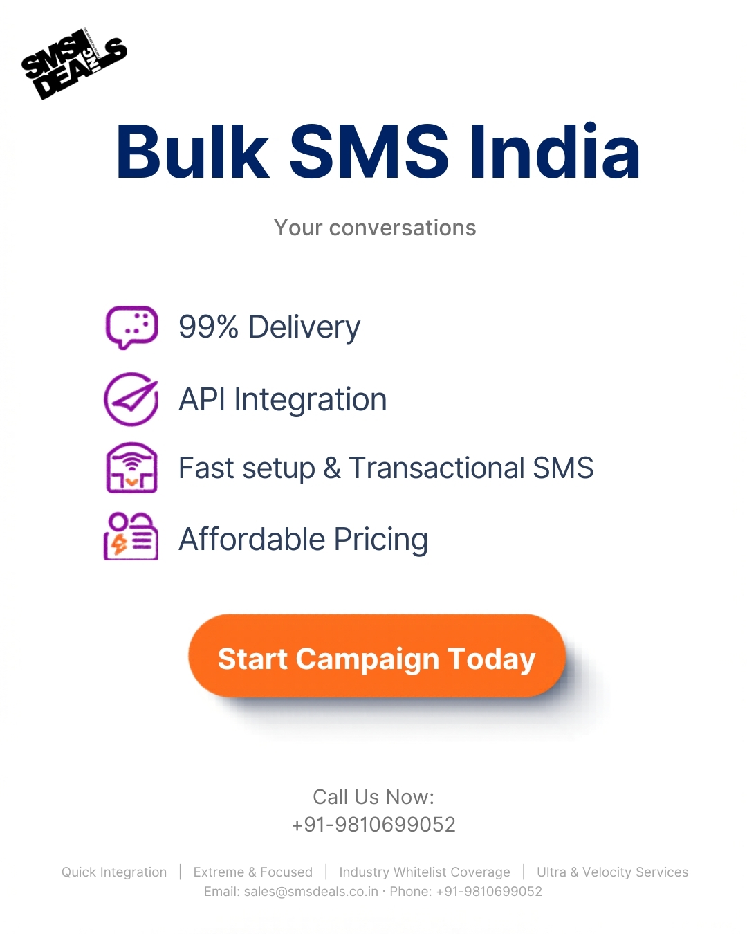 Bulk SMS in India is a powerful tool for businesses to connect with customers instantly and effectively. Our reliable Bulk SMS Service in India offers fast delivery, easy integration, and advanced features to streamline your communication. Whether you're sending promotions, alerts, or updates, our platform ensures maximum reach and impact. As a leader in SMS Marketing India, we help businesses enhance engagement and drive results. With affordable pricing and scalable solutions, our services are ideal for startups to enterprises. https://www.smsdeals.co.in/bulk-sms-india